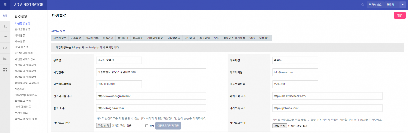 1. 서버에 파일 설치 후 (폴더안에 solution-db.sql 파일을 찾아서 phpMyAdmin에서 가져오기로 데이터베이스를 구성해준다. 또한 data폴더에 dbconfig.php를 찾아서 내 서버에 맞게 계정명 등 입력해준다.) 관리자 로그인 후 (관리자 아이디, 비번 폴더안의 관리자.txt에 입력되어있습니다.) 기본환경 설정에서 기본적인 회사정보를 입력해줍니다. (입력하시면 사이트 하단 정보에 자동으로 입력됩니다. sns도 자동 세팅됩니다.) 혹 solution-db.sql을 사용하지 않으시는 분은 테마설정에서 꼭 마사지 솔루션을 선택해주세요. 로고도 변경하실 수 있습니다.