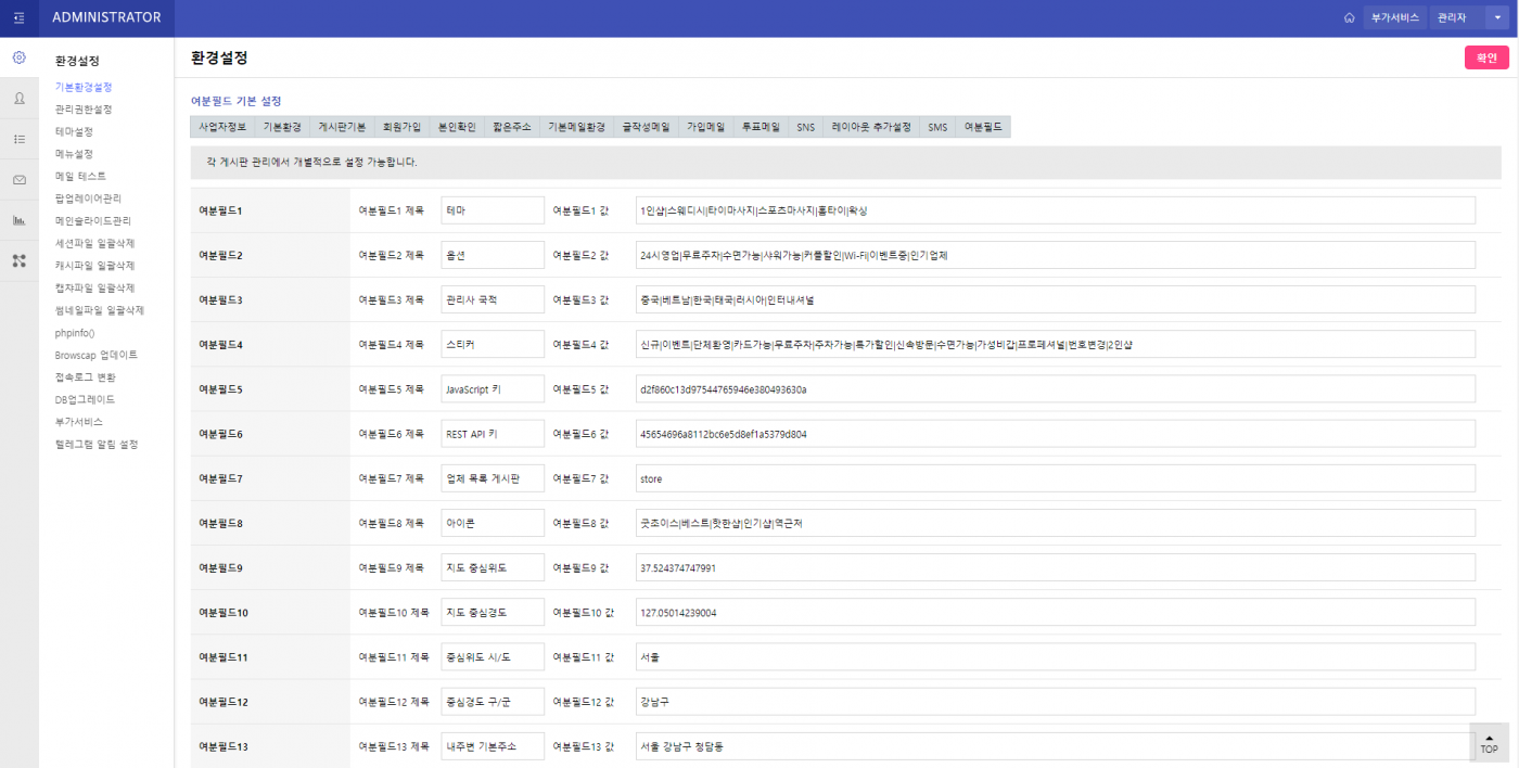마지막으로 여분필드 13은 내주변에 기본적으로 세팅되는 주소입니다. 현재는 서울 강남구 청담동으로 되어 있습니다. 위치기반 동의하시면 본인이 계시는 주소로 뜹니다.