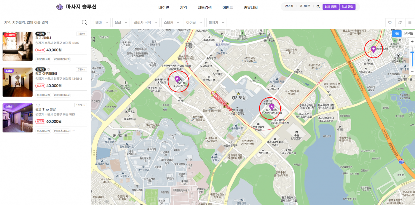2. 여분필드에 테마, 옵션, 관리사 국적, 스티커를 구분자 | 를 이용해 입력해줍니다.(업체 상세내용 입력 시 필요한 사항) 여기서 옵션을 다른것을 입력 시 theme/massage/skin/board/ms_store/img/option 폴더안에 option.psd파일을 활용하여 (당연히 옵션명에 맞는 아이콘을 생성 해주셔야 합니다.) 이미지 파일을 생성합니다. 옵션 하나당 2개 생성하셔야 합니다. (ex 옵션명이 24시영업일 시 이미지 2개를 생성해서 폴더안에 넣어줍니다. 24시영업.png , 24시영업-on.png) 그럼 업체 상세정보에서 아래와 같이 세팅됩니다. 그리고 여분필드 5, 6는 카카오 api 키값을 입력합니다.