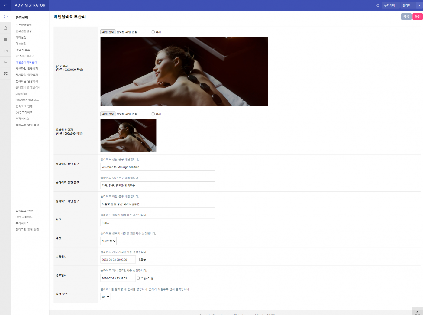 2. 메인슬라이드 관리 - 메인에 나오는 슬라이드를 관리하는 곳 입니다. 이미지 사이즈를 꼭 지켜주시기 바랍니다.