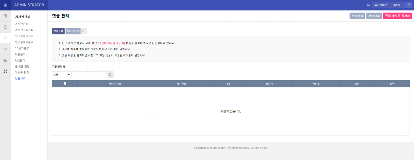 3. 댓글 관리 - 업체 이용후기를 관리하는 곳입니다. 꼭 사용전 전체 게시판 동기화 버튼을 눌러서 세팅해주세요.