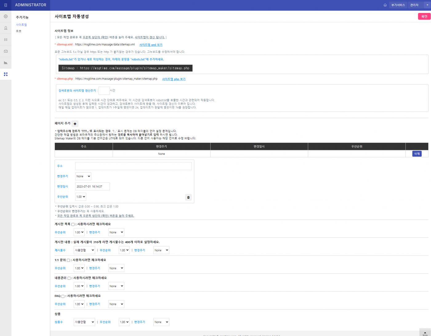 5. 사이트맵 자동생성 - 세팅을 해주시면 사이트맵이 자동으로 생성됩니다.