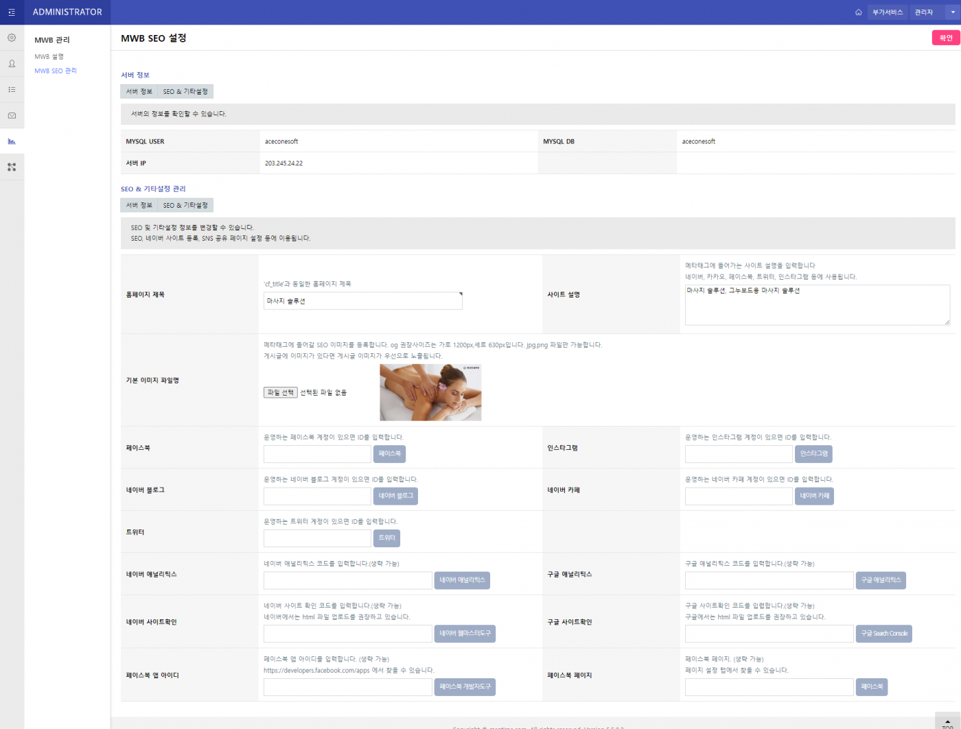 7. seo 설정 - meta태그에 들어갈 내용을 설정하는 곳 입니다.