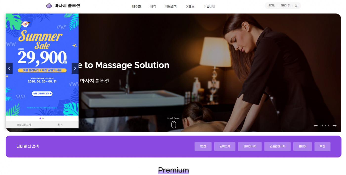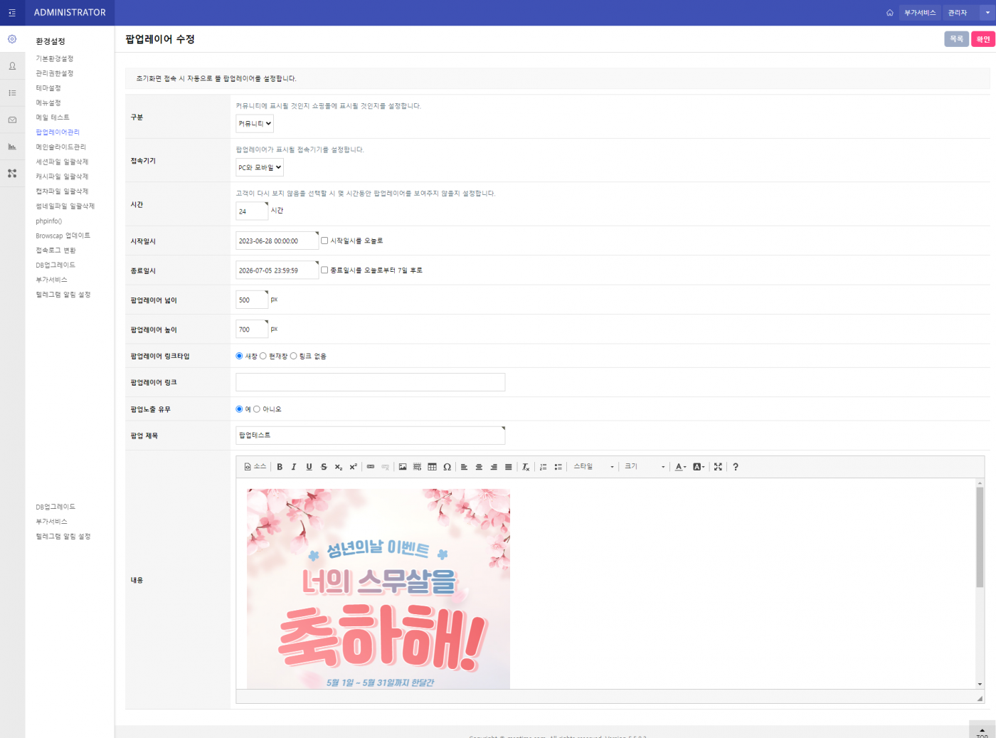 8. 팝업관리 - 기존 팝업레이어관리에 몇가지 기능을 추가했습니다. 팝업창 여러개 입력 시 슬라이딩되도록 하였습니다.