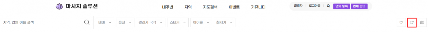 5. 혹 위치기반이 활성화 되어있어 목록이 뜨지 않을 경우 상단의 리프레쉬 버튼을 클릭하면 현재 세팅되어있는 서울 강남구로 전체목록이 나옵니다. 지도검색도 마찬가지입니다.